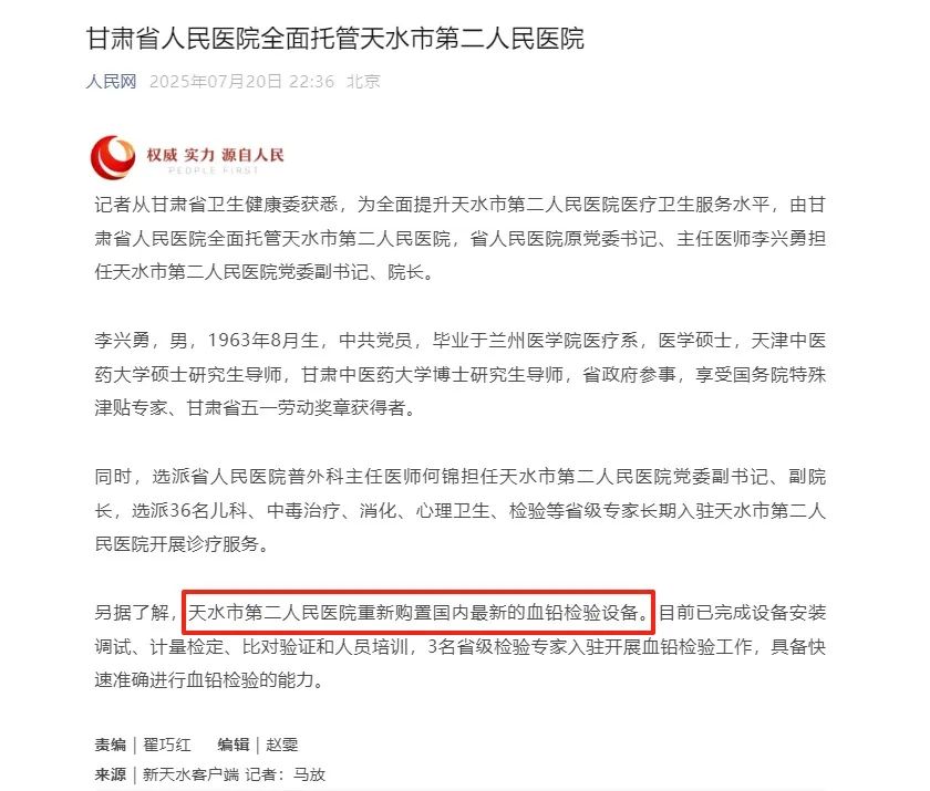 該設備為國家二類醫(yī)療器械,按照省委省政府調查組主導下通過甘肅省計量研究院權威檢定,并嚴格按照省級專家組制定的應急檢測標準流程完成安裝調試與比對驗證,由三名省級檢驗專家進駐使用,天水市第二人民醫(yī)院血鉛檢測能力的準確性、快速性和合規(guī)性將得到大幅提升。