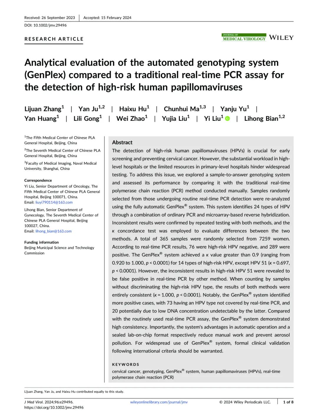 近日,中國人民解放軍總醫(yī)院第五醫(yī)學中心劉毅教授團隊在《Journal of Medical Virology》(影響因子=12.7)發(fā)布了一項關于高危HPV檢測的重要研究成果,題目為“Analytical evaluation of the automated genotyping system (GenPlex) compared to a traditional real‐time PCR assay for the detection of high‐risk human papillomaviruse”。(全自動基因分型檢測系統(tǒng)(GenPlex)與傳統(tǒng)實時熒光PCR方法用于檢測高危型人乳頭瘤病毒的分析評估)。